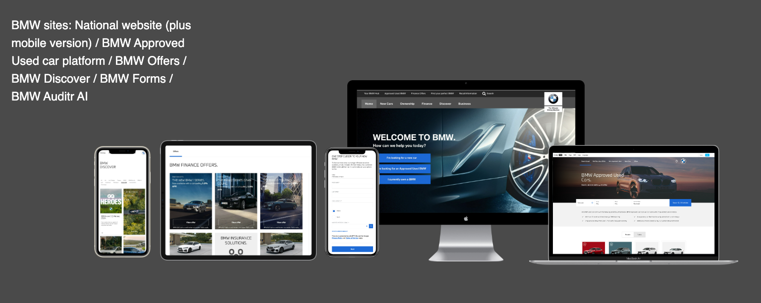As Creative / Content Lead on the BMW UK Digital account, my responsibilities included everything from creative direction and content creation to user experience and platform strategy. Platforms included the BMW national website, BMW Discover, BMW Offers, BMW Forms, Approved Used BMW site, BMW Auditr (AI) and several more. Here are a few highlights.